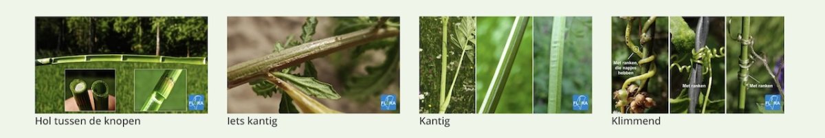 Ook de stengel van een plant heeft vaak interessante kenmerken, waarmee je in staat bent om diverse plantensoorten van elkaar te onderscheiden. Want denk alleen al maar eens aan de kleur van de stengels. Die is meestal groen, maar niet altijd. Soms wordt de stengel aan de wat oudere plant enigszins stug of hard en soms verhout die zelfs. Dan kleurt de (hoofd)stengel vaak naar rood of roodbruin. Ook de doorsnede van de stengel kan een belangrijke aanwijzing geven. Is de stengel rond, vierkant, kantig, hol of gevuld.
