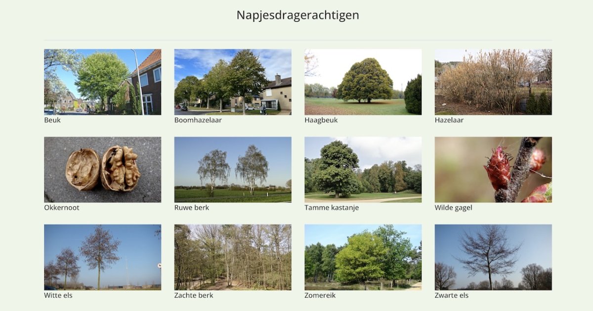 De groep der Napjesdragerachtigen omvat bomen en struiken. Binnen de Napjesdragersfamilie onderscheiden we Beuk, Eiken en Tamme kastanje; de twee soorten uit de Gagelfamilie zijn Wilde gagel en Wasgagel; binnen de Berkenfamilie vinden we Berken, Elzen, Haagbeuk en Hazelaar; en de Okkernoot is de enige vertegenwoordiger uit de Okkernootfamilie.