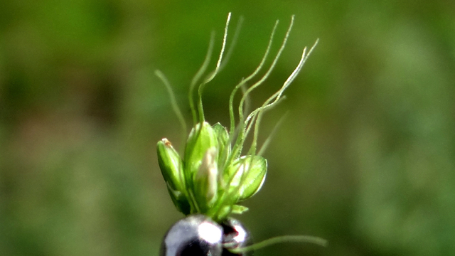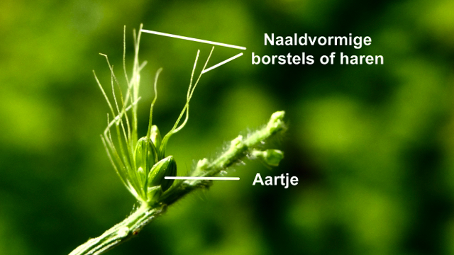 De borstels in de bloeiwijze verdienen ook de nodige aandacht. Er staan er meestal zo'n twee tot zeven vanaf de basis van elk aartje. Ze zijn 2-3 x zo lang als een aartje, verschillend van lengte en de kleur van deze naaldvormige borstels is wit tot groen; er is geen kleurverloop bij deze borstels, zoals we dat kennen van de Geelrode naaldaar. De borstels zijn bezet met kleine weerhaakjes, die naar voren wijzen en niet terug. Om al deze details goed te kunnen zien moet je een loep gebruiken.