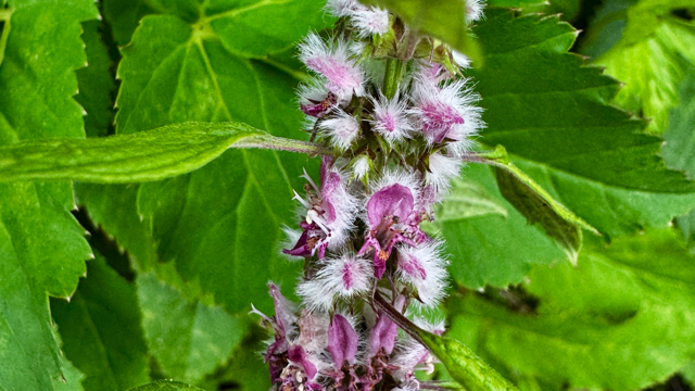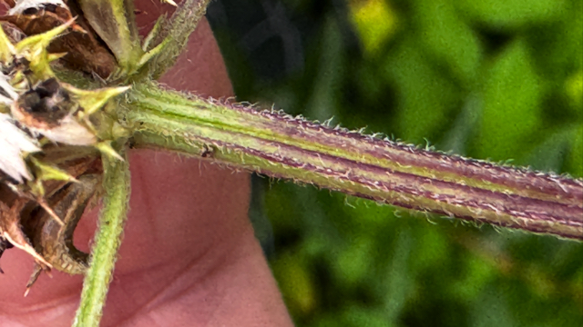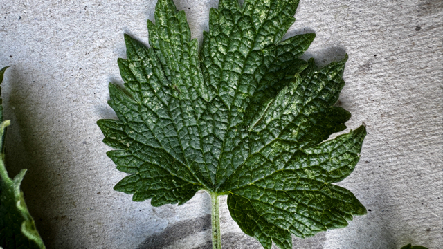Op het ondergrondse wortelstelsel ontwikkelt zich een rechtopstaande stengel die vertakt waardoor de hele plant een wat bossig uiterlijk, of habitus, kan hebben. De bladeren staan tegenover elkaar en zelfs kruisgewijs aan de vierkante stengel. De vorm der bladeren is nogal verschillend. Beneden aan de plant staantamelijk grote handvormige bladeren met nogal diep ingesneden en daardoor vijf spitse bladdelen. Naar boven toe worden ze kleiner en midden in zijn ze driespletig, terwijl ze naar boven toe lancetvormig zijn. De bladranden zijn daarbij grof gezaagd. Alle plantendelen zijn bezet met fijne haren.
