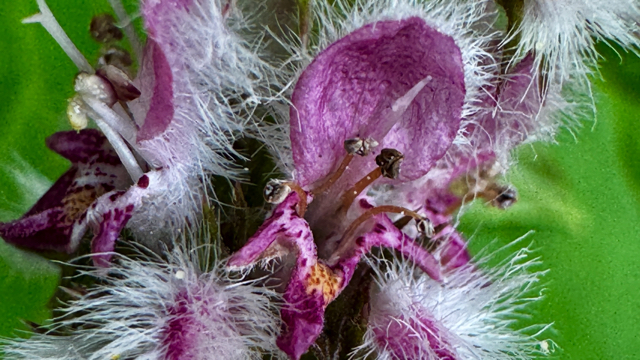 De lipbloemen met roze tot rode kronen staan in schijnkransen in de oksels van bladeren. De kelken zijn vijftandig met een stekelpunt waarvan de onderste twee naar voren en beneden zijn gebogen. In de knop zijn de kronen al sterk behaard met witte en deze beharing blijft op de geopende kronen goed zichtbaar. De bloemen zijn tweemachtig, dat wil zeggen dat ze twee lange en twee korte meeldraden hebben die onder de bovenlip gebogen zijn. Ze steken niet buiten de bovenlip van de bloemkroon uit. Dat doet de tweelobbige stempel wel. Die steekt ver naar buiten, zodat stuifmeel of pollen dat op de rug van een bezoekend insect zit aan de stempellobben wordt afgewreven. Het bovenstandig vruchtbeginsel groeit na bestuiving en bevruchting uit tot een vierdelige splitvrucht.