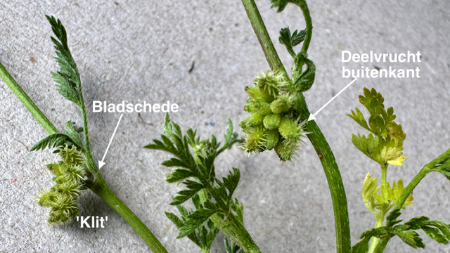 De bloemen hebben witte bloemkroonbladen en priemvormige kelktanden. Deze kelktanden zijn zelfs groter dan de kroonbladen; ook heel opmerkelijk voor een schermbloemige. De onderstandige vruchtbeginsels groeien na bevruchting uit tot splitvruchten. Daarbij zijn vruchthelften aan de buitenkant van zo'n compact scherm bezet met stekels terwijl de naar binnen gekeerde helft enkel bezet is met knobbeltjes. Die stekels aan de buitenkant dragen ertoe bij dat de vrucht wel wat heeft van klitten en dan ook aan de vacht van dieren, zoals schapen, kan worden getransporteerd.