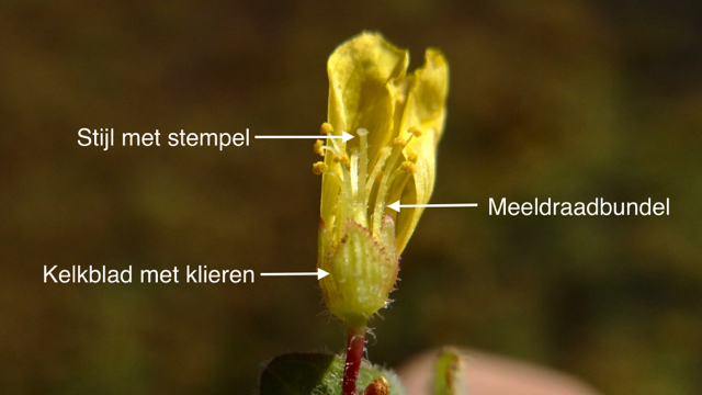 Andere (bloem-) kenmerken zijn nog dat de kelkbladen, niet de kroonbladen, aan de rand voorzien zijn van rood gesteelde klieren, en dat er drie bundels van meeldraden in iedere bloem te vinden zijn.