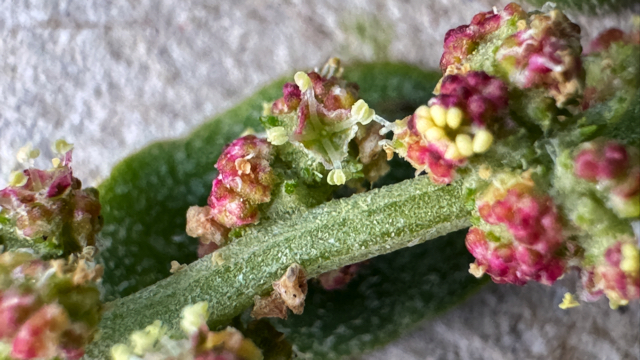 De bloeiwijzen aan de toppen van de stengels zijn aar tot pluimvormig en de kleine bloemen zitten in clusters of kluwens bijeen. Je vindt in de bloeiwijze twee typen bloemen door elkaar, namelijk mannelijk bloeiende meeldraadbloemen en vrouwelijke stamperbloemen. De mannelijk bloeiende bloemen hebben een bloemdek met vijf bloemdekbladen en vijf meeldraden die op de bloemdekbladen staan ingeplant. De stamperbloemen hebben een bovenstandig vruchtbeginsel met een stijl en twee stempellobben. Er staat geen bloemdek omheen, maar er zijn twee zogenaamde steelblaadjes die het vruchtbeginsel omvatten en als een beursje omsluiten. Deze steelblaadjes zijn aan de vlakke voet met elkaar vergroeid en blijven om de vrucht zitten. Deze steelblaadjes zijn driehoekig en enigszins getand. Er kunnen overigens altijd wel een paar tweeslachtige bloemen gevonden worden in de bloeiwijze.