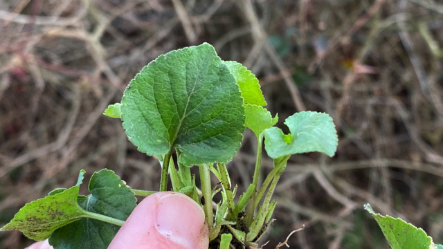 De donkergroene bladeren staan verspreid aan de kruipende stengels; ze zijn hartvormig, rond aan de top en bijna nooit spits toelopend. De bladrand is gekarteld. Onderaan de bladsteel staan twee grote langwerpig-driehoekige steunblaadjes.