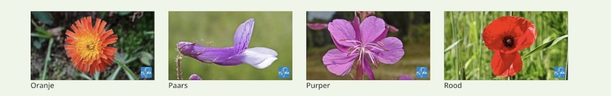 We geven bij iedere kleur een paar voorbeelden, waarbij dan ook lichtere of donkere schakeringen voorkomen of overgangstinten naar andere kleuren. Er zijn ook bloemen die meerdere kleuren hebben. Dat zie je soms ook terug in de naam van zo'n plantensoort, bijvoorbeeld het Driekleurig viooltje.