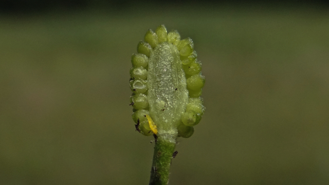 Onder de Boterbloemen vinden we een soort met relatief kleine bloemen van net geen cm in doorsnee met een opvallend hoge zuil van vruchtbeginsels. Het is de Blaartrekkende boterbloem, Ranunculus sceleratus L., uit de Ranonkelfamilie of Ranunculaceae.