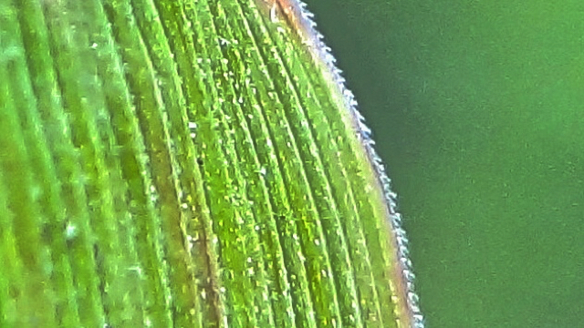 De ribben op de bladbovenkant zijn dicht opeen geplaatst, springen sterk uit en zijn scherp driehoekig in doorsnede. Het spitse tongetje dat op de overgang van bladschede en bladschijf te vinden is, is tot 5 mm lang.