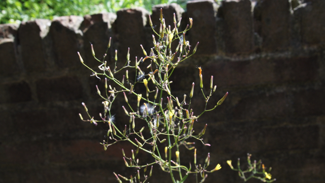 Muursla, Mycelis muralis, herken je het beste aan de kleine smalle hoofdjes met daarin maar vijf lichtgele lintbloemen. Opvallend zijn verder de verspreid zittende bladeren die diep zijn ingesneden en een grote getande vijf- of drielobbige eindslip hebben. Het blad is een schoolvoorbeeld van wat we omschrijven als een liervormig blad.