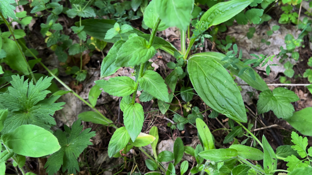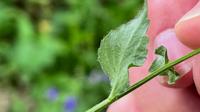 Op de ondergrondse delen, een penwortel met zijwortels, ontwikkelt zich een rechtopstaande, kantige stengel, die bovenaan kaal maar onderaan licht behaard is. De bladeren zitten zonder bladsteel verspreid aan de stengel. Ze zijn eirond tot driehoekig met een beetje hartvormige voet. Hun bladrand is licht gezaagd met grove zaagtanden.