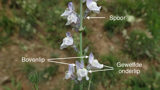 De bloemen zijn net als bij Vlasbekje duidelijk gespoord, maar de spoor is in verhouding tot de hele bloem wat korter, zelfs minder dan half zo lang als de rest van de bloemkroon, ongeveer 4 mm, en daarbij aan het eind stomp. De bloemkroon is lichtblauw tot licht lila van kleur en wordt getekend door paarsblauwe strepen, waar de plantensoort zijn Nederlandse naam aan te danken heeft. De kelk bestaat uit vijf smalle kelkbladen. De kroon is tweelippig, waarbij de bovenlip bestaat uit twee vergroeide kroonbladen en de onderlip uit drie vergroeide kroonbladen. Ook is er een gele vlek op de onderlip en boven- en onderlip sluiten de bloemopening af. Het is een maskerbloem. Bezoekers die nectar uit de spoor komen opzuigen moeten boven- en onderlip van elkaar open drukken. Als ze dan naar binnen glippen kunnen ze bestuiving en vervolgens bevruchting veroorzaken. Uit het vruchtbeginsel ontwikkelt zich de doosvrucht waaruit de driehoekige zaden verspreid worden.