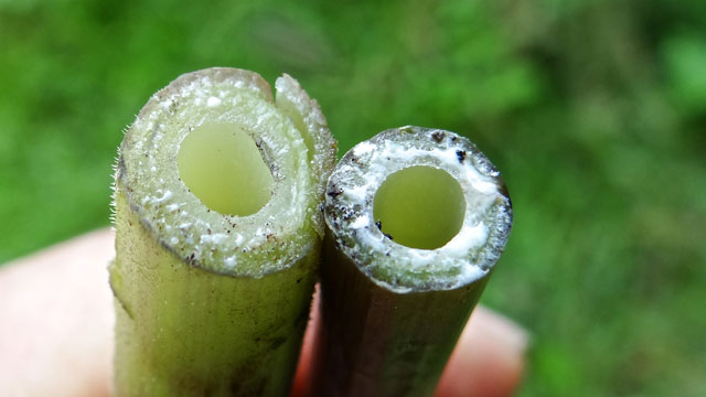 In het tweede, maar meestal pas derde jaar van vestiging gaat de plant bloeien. Uit de rozet ontstaat een rechtopstaande stengel, waaraan de meervoudig geveerde bladeren met een grote schede staan bevestigd. De stengel is rond en duidelijk gestreept. De kleur van de stengel is vaak roze tot purpur en bruin. Ook heeft de stengel een berijpt aanzien.