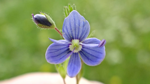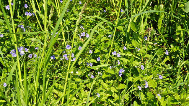In de lente valt in onze graslanden en bermen en soms in lichte loofbossen het hemelsblauwe tamelijk groot en daardoor opvallende bloemetje van de Gewone ereprijs, Veronica chamaedrys L., uit de Weegbreefamilie, of Plantaginaceae, op.