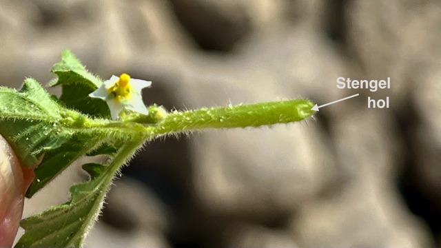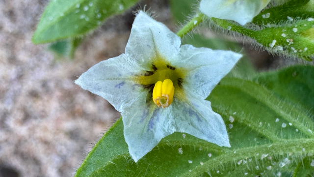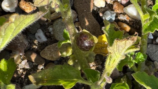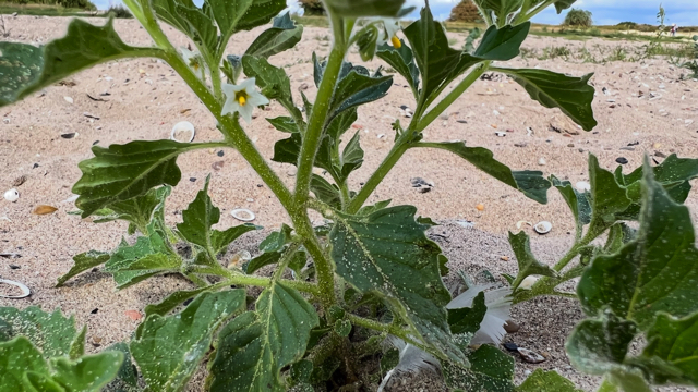 Een eenjarige soort die het goed doet op zandige bodems, bijvoorbeeld op uiterwaarden en zandige rivierstrandjes, is Glansbesnachtschade, Solanum nitidibaccatum Bitter, uit de Nachtschadefamilie of Solanaceae.