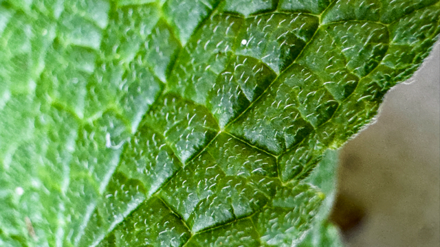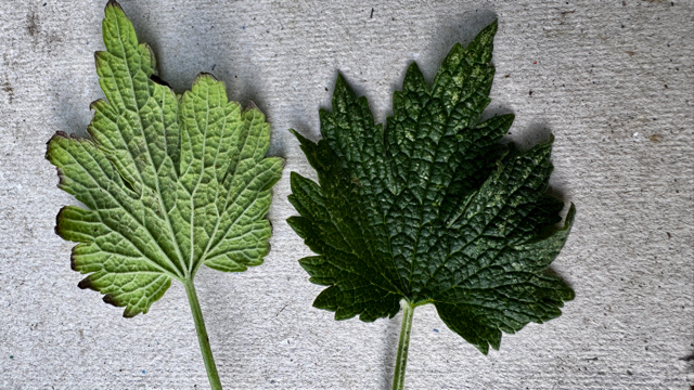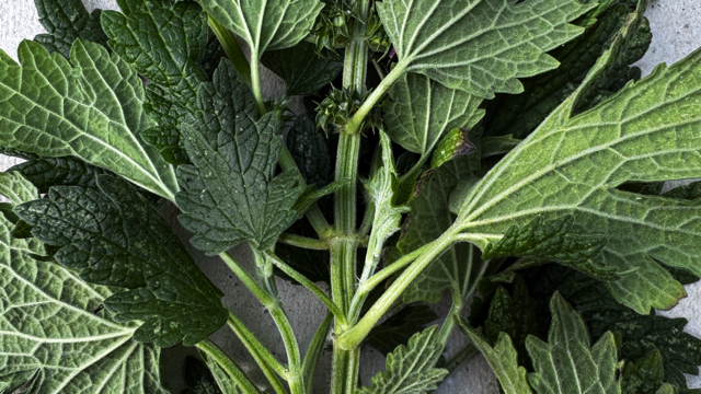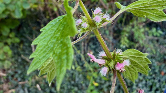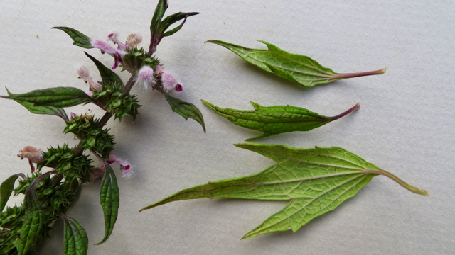 Op het ondergrondse wortelstelsel ontwikkelt zich een rechtopstaande stengel die vertakt waardoor de hele plant een wat bossig uiterlijk, of habitus, kan hebben. De bladeren staan tegenover elkaar en zelfs kruisgewijs aan de vierkante stengel. De vorm der bladeren is nogal verschillend. Beneden aan de plant staantamelijk grote handvormige bladeren met nogal diep ingesneden en daardoor vijf spitse bladdelen. Naar boven toe worden ze kleiner en midden in zijn ze driespletig, terwijl ze naar boven toe lancetvormig zijn. De bladranden zijn daarbij grof gezaagd. Alle plantendelen zijn bezet met fijne haren.