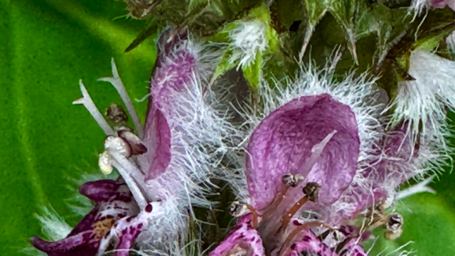 De lipbloemen met roze tot rode kronen staan in schijnkransen in de oksels van bladeren. De kelken zijn vijftandig met een stekelpunt waarvan de onderste twee naar voren en beneden zijn gebogen. In de knop zijn de kronen al sterk behaard met witte en deze beharing blijft op de geopende kronen goed zichtbaar. De bloemen zijn tweemachtig, dat wil zeggen dat ze twee lange en twee korte meeldraden hebben die onder de bovenlip gebogen zijn. Ze steken niet buiten de bovenlip van de bloemkroon uit. Dat doet de tweelobbige stempel wel. Die steekt ver naar buiten, zodat stuifmeel of pollen dat op de rug van een bezoekend insect zit aan de stempellobben wordt afgewreven. Het bovenstandig vruchtbeginsel groeit na bestuiving en bevruchting uit tot een vierdelige splitvrucht.
