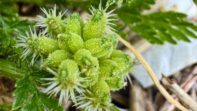 Knopig doornzaad, Torilis nodosa, is een laag blijvende voor een deel liggende en aan de stengeluiteinden wat opstijgende plantensoort van grazige dijkhellingen. De bloeiwijzen, het zijn kleine schermen, vallen niet zo op omdat ze niet aan het einde van de stengels staan maar tegenover de verspreid staande meervoudig geveerde bladeren. De vruchten zijn splitvruchten met verschillende typen buitenkant. De ene helft heeft stekels en de andere helft kleine knobbels. In zo'n scherm zitten de vruchthelften met stekels aan de buitenkant en die met de knobbels aan de binnenkant. Heel effectief voor de verspreiding door dieren.