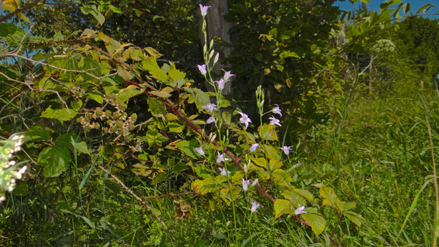 Tijdens de bloei vallen de fraaie trechtervormige en blauw tot lila gekleurde bloemen op aan de lange stengel van Rapunzelklokje, Campanula rapunculus L. uit de Klokjesfamilie.