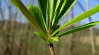 De wat grijsgroene bladeren zijn langwerpig tot lancetvormig en enigszins spatelvormig. Je kunt er een heel korte steel aan onderscheiden, maar steunblaadjes ontbreken geheel en al. Ze vallen in de herfst af, waardoor de planten in de winter enkel bestaan uit takken met bruinzwarte knoppen. De rand van de bladeren is gaaf. De takken hebben een geelgrijze tot bruingrijze bast en zijn aanvankelijk behaard. Maar die beharing verdwijnt later.