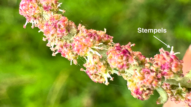 De bloeiwijzen aan de toppen van de stengels zijn aar tot pluimvormig en de kleine bloemen zitten in clusters of kluwens bijeen. Je vindt in de bloeiwijze twee typen bloemen door elkaar, namelijk mannelijk bloeiende meeldraadbloemen en vrouwelijke stamperbloemen. De mannelijk bloeiende bloemen hebben een bloemdek met vijf bloemdekbladen en vijf meeldraden die op de bloemdekbladen staan ingeplant. De stamperbloemen hebben een bovenstandig vruchtbeginsel met een stijl en twee stempellobben. Er staat geen bloemdek omheen, maar er zijn twee zogenaamde steelblaadjes die het vruchtbeginsel omvatten en als een beursje omsluiten. Deze steelblaadjes zijn aan de vlakke voet met elkaar vergroeid en blijven om de vrucht zitten. Deze steelblaadjes zijn driehoekig en enigszins getand. Er kunnen overigens altijd wel een paar tweeslachtige bloemen gevonden worden in de bloeiwijze.