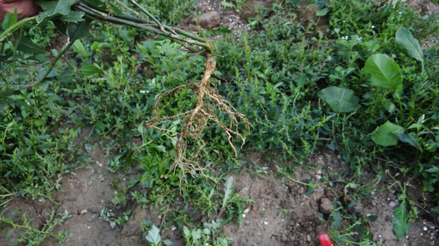 Op de penwortel ontwikkelt zich een tot rond een meter hoge plant, die aan de voet van de hoofdstengel uitlopers heeft in alle vier de richtingen. Daardoor heeft dit kruid al snel iets weg van een struik, maar er zijn geen verhoute delen. De bladeren zijn driehoekig en hebben aan de voet twee duidelijk naar opzij en soms iets naar achteren uitstekende tanden, waardoor het blad een spiesvorm heeft.