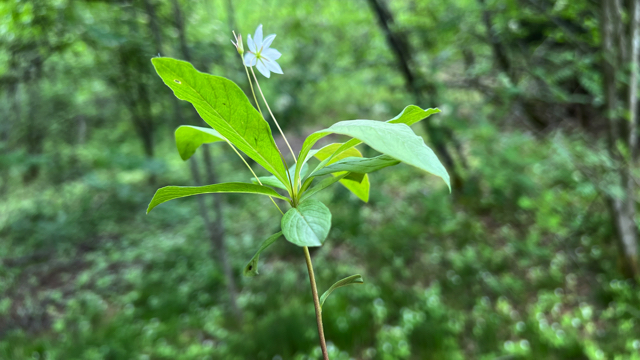 In de oksels van deze min of meer kransstandige bladeren ontwikkelen zich alleenstaande bloemen op een tamelijk lange, dunne bloemsteel. De bloemen hebben zes tot acht, maar meestal zeven priemvormige kelkslippen en evenzovele witte kroonbladen. Voor de kroonbladen staan meeldraden en in het centrum staat een bovenstandig vruchtbeginsel met stijl en stempel. Een enkele keer zijn de kroonbladen roze. Uit het vruchtbeginsel ontwikkelt zich na bestuiving en bevruchting een doosvrucht met daarin de zaden. De doosvrucht opent zich met terugrollende kleppen.